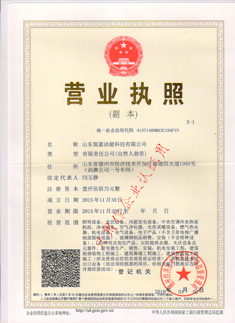 山東筑藍(lán)潔能科技有限公司創(chuàng)建于2015年,擁有建筑業(yè)企業(yè)資質(zhì)證書--城市及道路照明工程專業(yè)承包叁級,是一家集設(shè)計、生產(chǎn)制造、安裝服務(wù)于一體的新能源企業(yè),專業(yè)從事太陽能路燈、LED路燈、高桿燈、庭院燈、景觀燈、中華燈、草坪燈、光伏設(shè)備、風(fēng)能發(fā)電設(shè)備的生產(chǎn)及銷售、安裝及售后服務(wù);同時還從事凈水設(shè)備、空氣凈化器、光伏采暖設(shè)備、燃?xì)鉄崴、機(jī)電設(shè)備、玻璃鋼制品的銷售、安裝,LED照明及亮化產(chǎn)品、太陽能熱水器、光伏設(shè)備及元器件生產(chǎn)、銷售、安裝;建筑裝飾裝修工程施工、兼建筑幕墻工程施工、建筑智能化工程施工等產(chǎn)品專業(yè)生產(chǎn)加工的公司,擁有完整、科學(xué)的質(zhì)量管理體系。